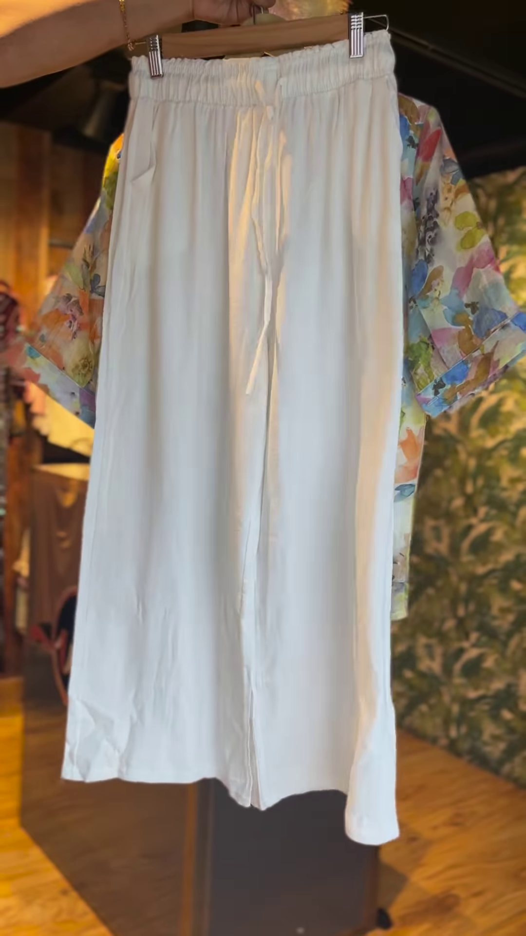 The accompanying trousers are tailored in a crisp white cotton-linen blend, giving the look a clean and airy vibe. With a straight-leg cut and elasticated waistband, these trousers are both flattering and easy to wear. Together, the set creates a refreshing and cheerful ensemble ideal for brunches, vacations, shopping sprees, or laid-back weekends.