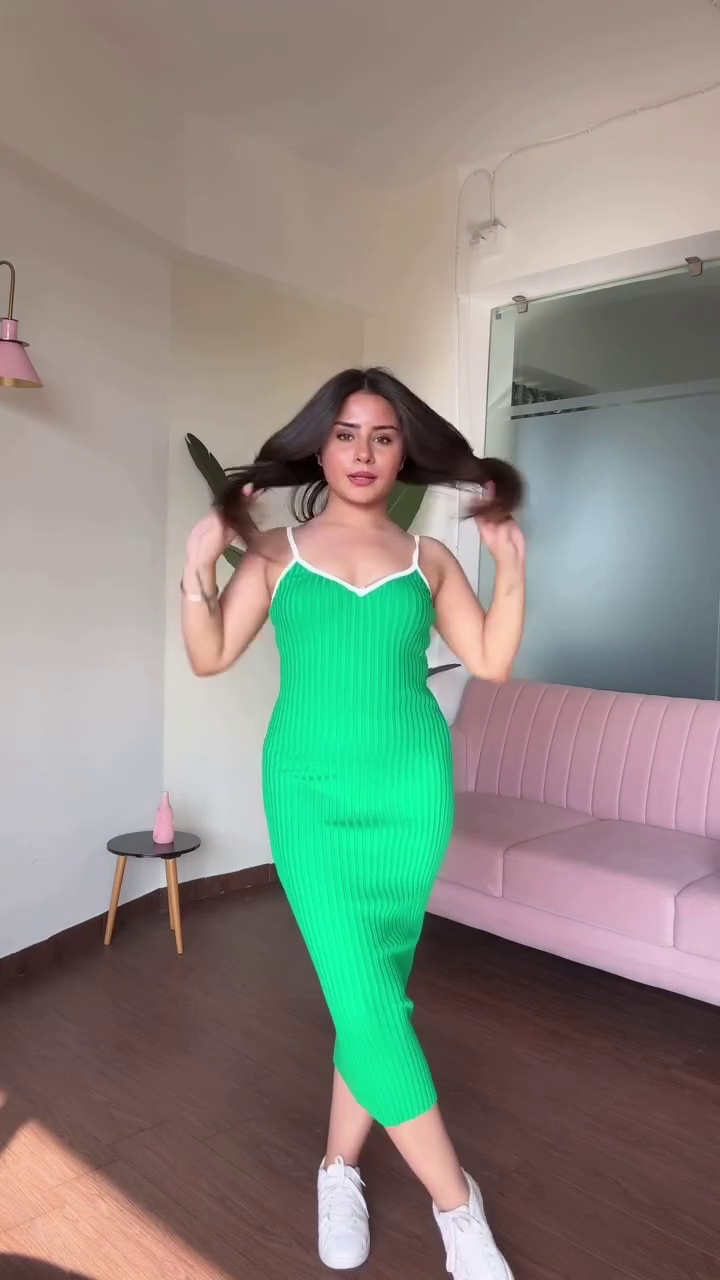 The setting—a well-lit room with modern decor—complements the outfit’s aesthetic. A pink upholstered couch echoes the blush of the dress, while a small round wooden side table with a pink vase adds warmth and texture. The wall-mounted light fixture with a pink shade introduces a soft glow, enhancing the overall ambiance. The dark wood flooring and frosted glass partition provide contrast and structure, creating a visual balance that’s both inviting and sophisticated.