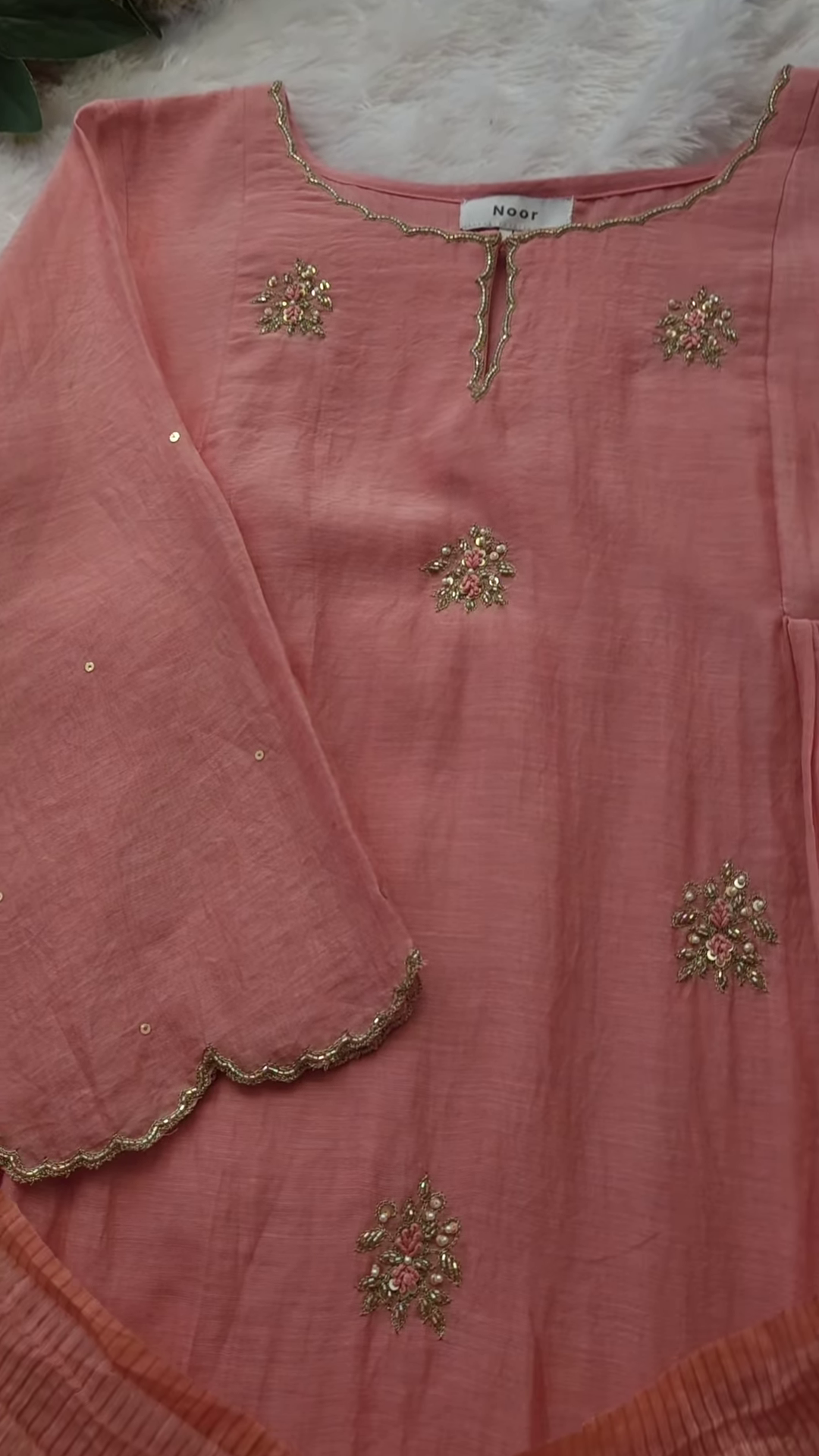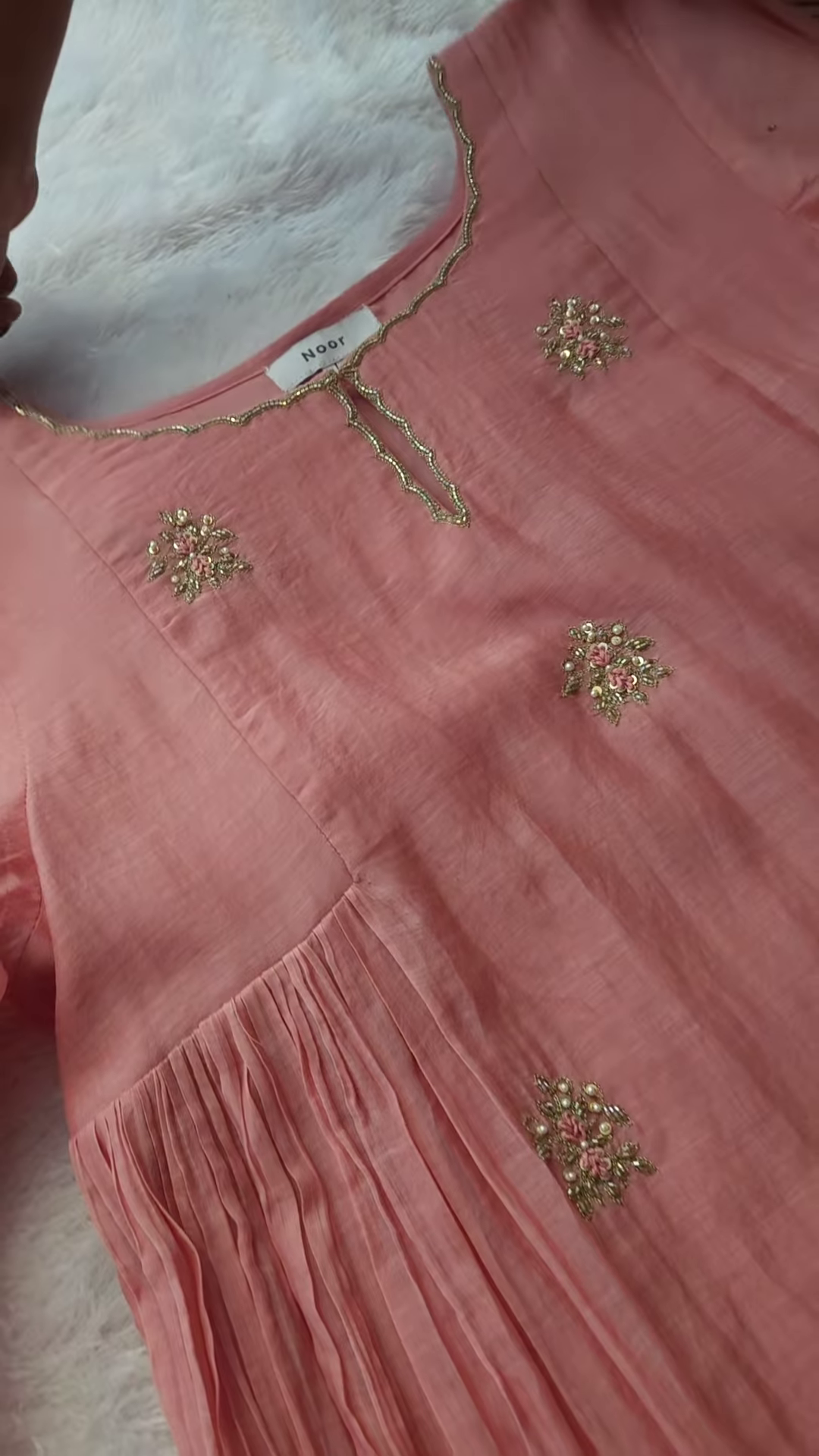 - Scalloped Borders: Elegant golden threadwork on sleeves and neckline