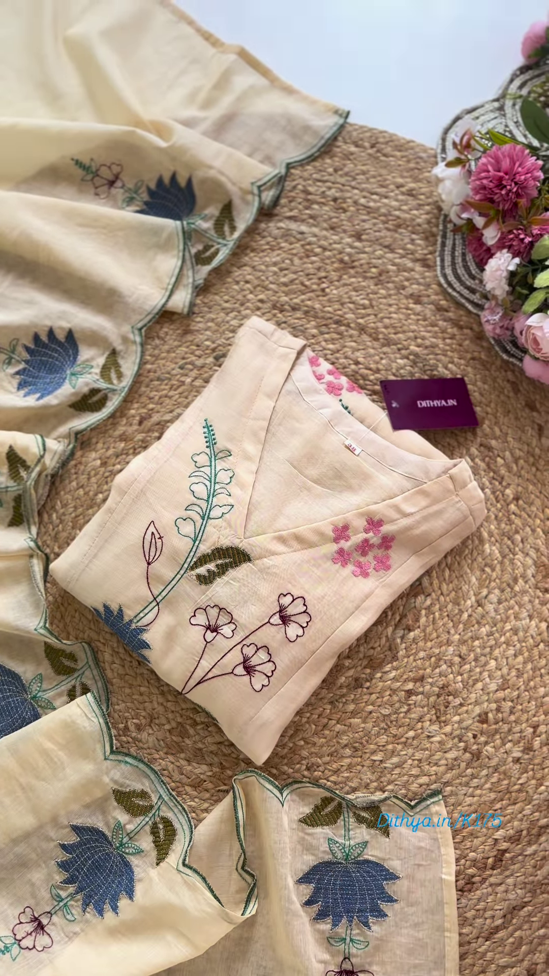 - Color: Off-white with multicolor floral embroidery