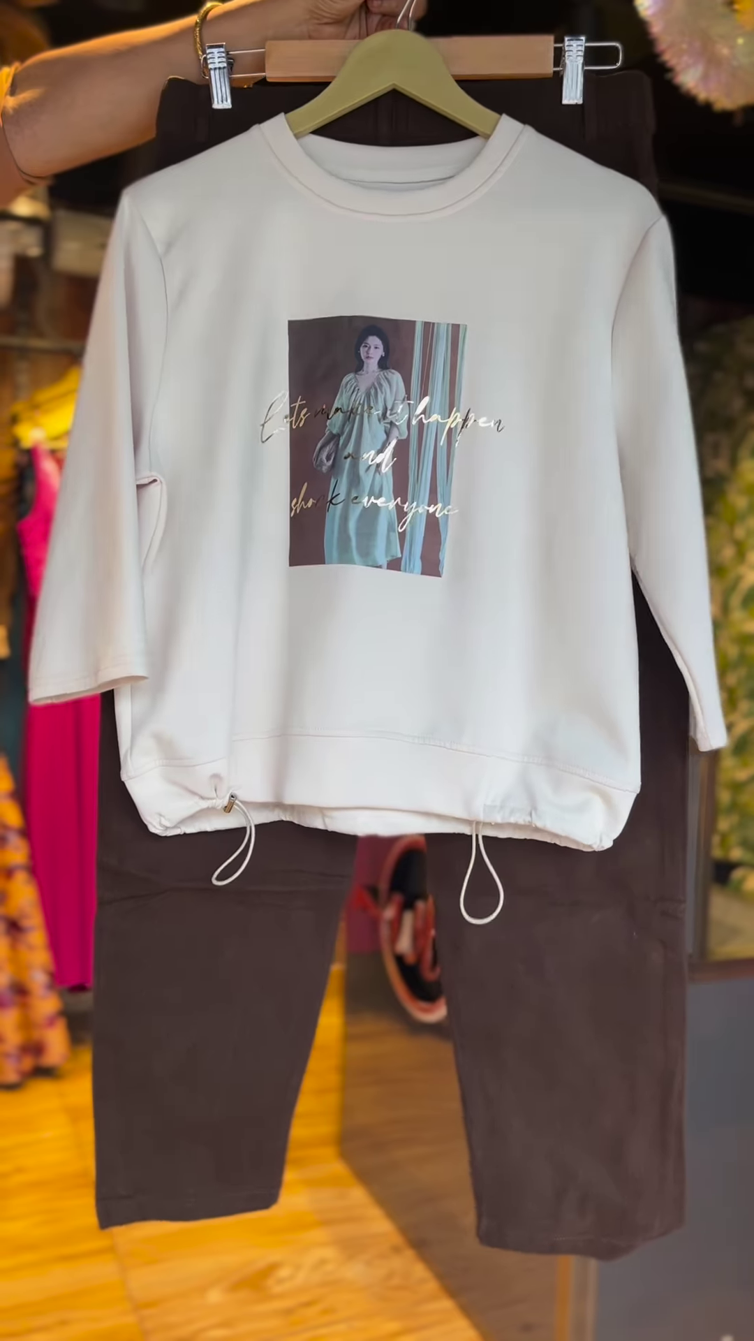 Where comfort meets character. The Graphic Muse co-ord set features a soft cream oversized sweatshirt with a fashion-forward graphic print — complete with metallic text that reads “Let’s make it happen and shock everyone” (your new power mantra ✨).