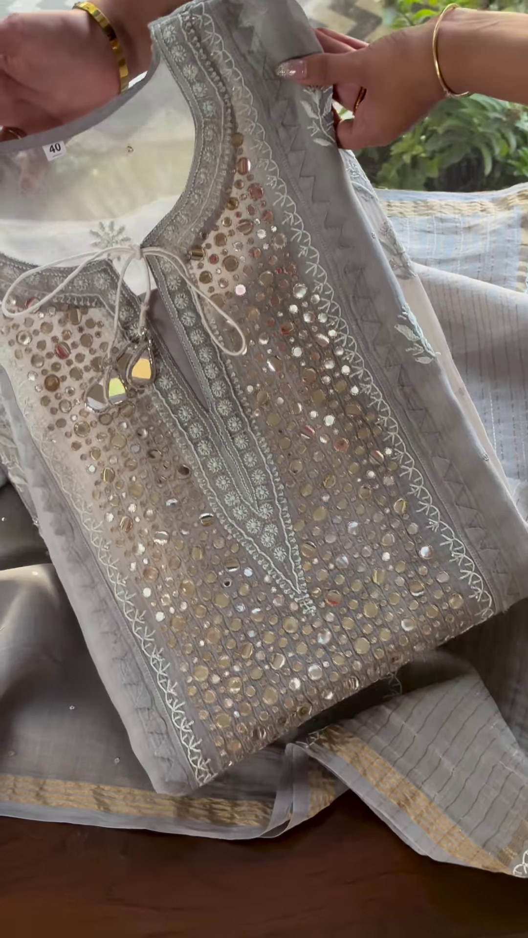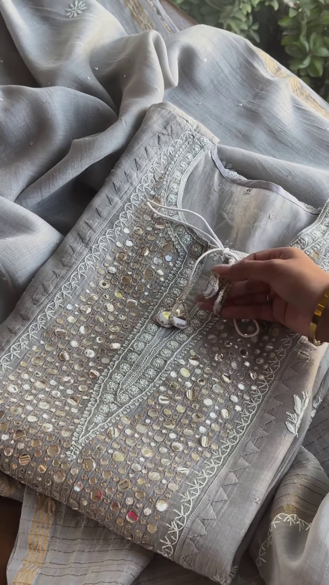 Adding a touch of subtle sparkle and visual interest to the fabric is the delicate mirror work. Small, often round or geometric-shaped mirrors are strategically incorporated within the Chikankari embroidery, catching the light and creating a gentle shimmer with movement. The mirrors are typically secured with neat and intricate stitching, seamlessly integrating them into the overall embroidered design. The placement of the mirrors appears balanced, enhancing the beauty of the Chikankari without overpowering its delicate nature.