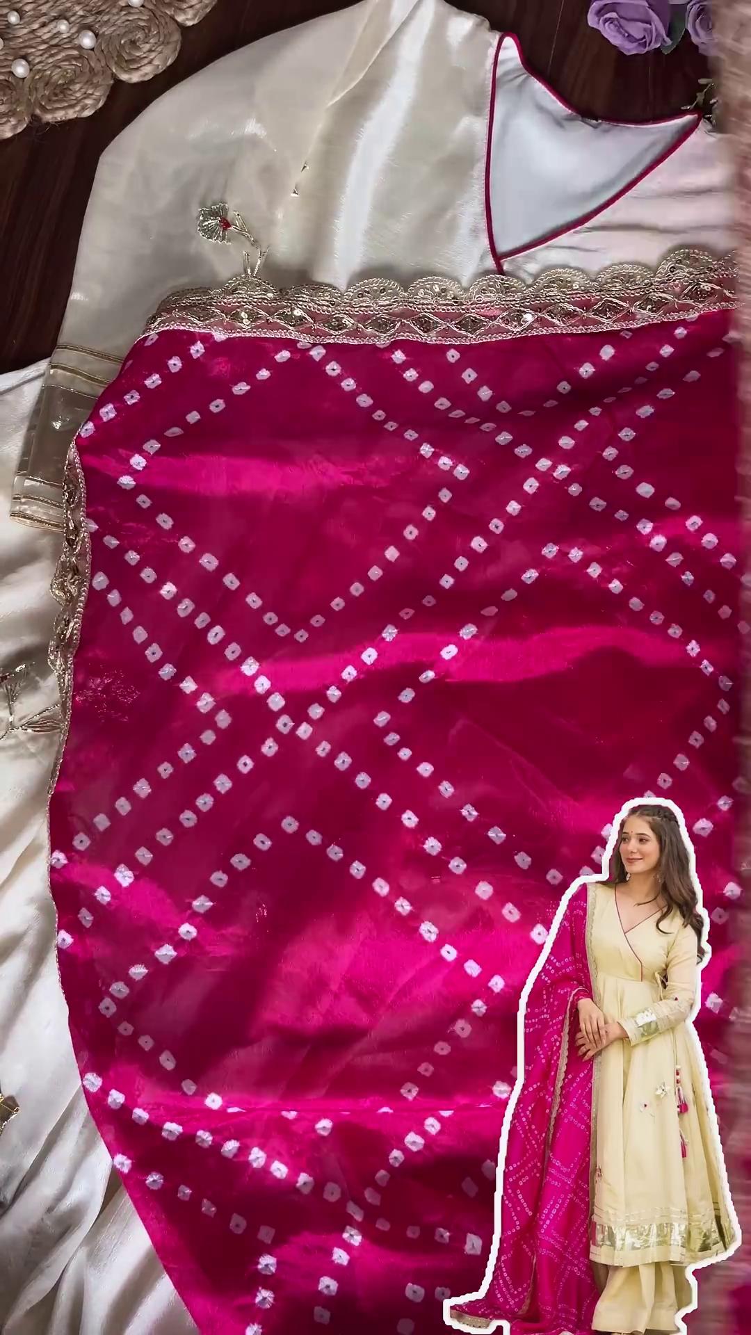 Lustrous Ivory Angrakha Anarkali with Bandhani Contrast Dupatta