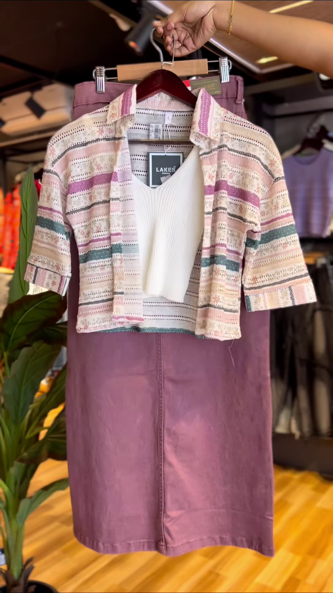 Say hello to texture and tone with our Mauve Muse set — a style-forward mix of vintage inspiration and modern layering. The dusty mauve skirt anchors the outfit in a rich, grounded hue, while the white ribbed crop top brings in a sleek contrast. Throw on the soft, patterned overlay with its crochet-knit vibes and you’ve got an effortlessly cool, artsy ensemble. It’s comfort with character — ideal for slow days filled with coffee, crafts, or creative adventures.