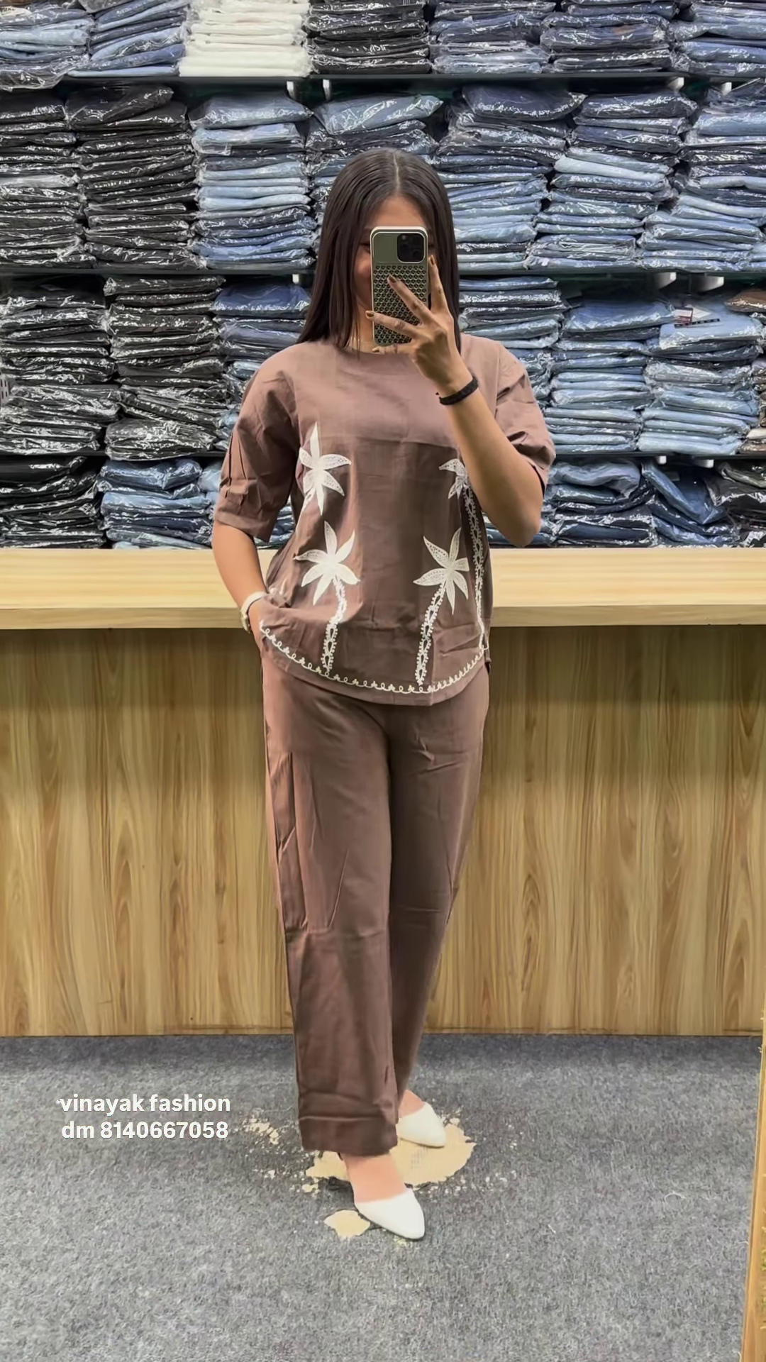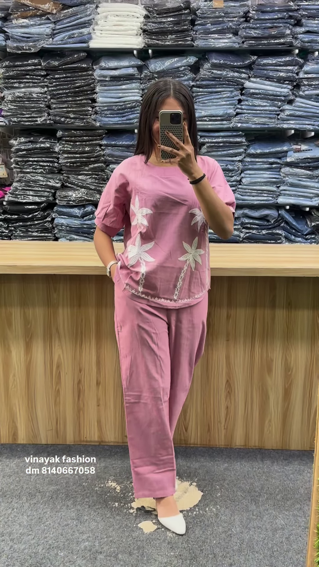 The top features delicate white floral embroidery, adding a charming touch of elegance. The intricate threadwork enhances the set’s appeal, making it a perfect blend of sophistication and casual style.