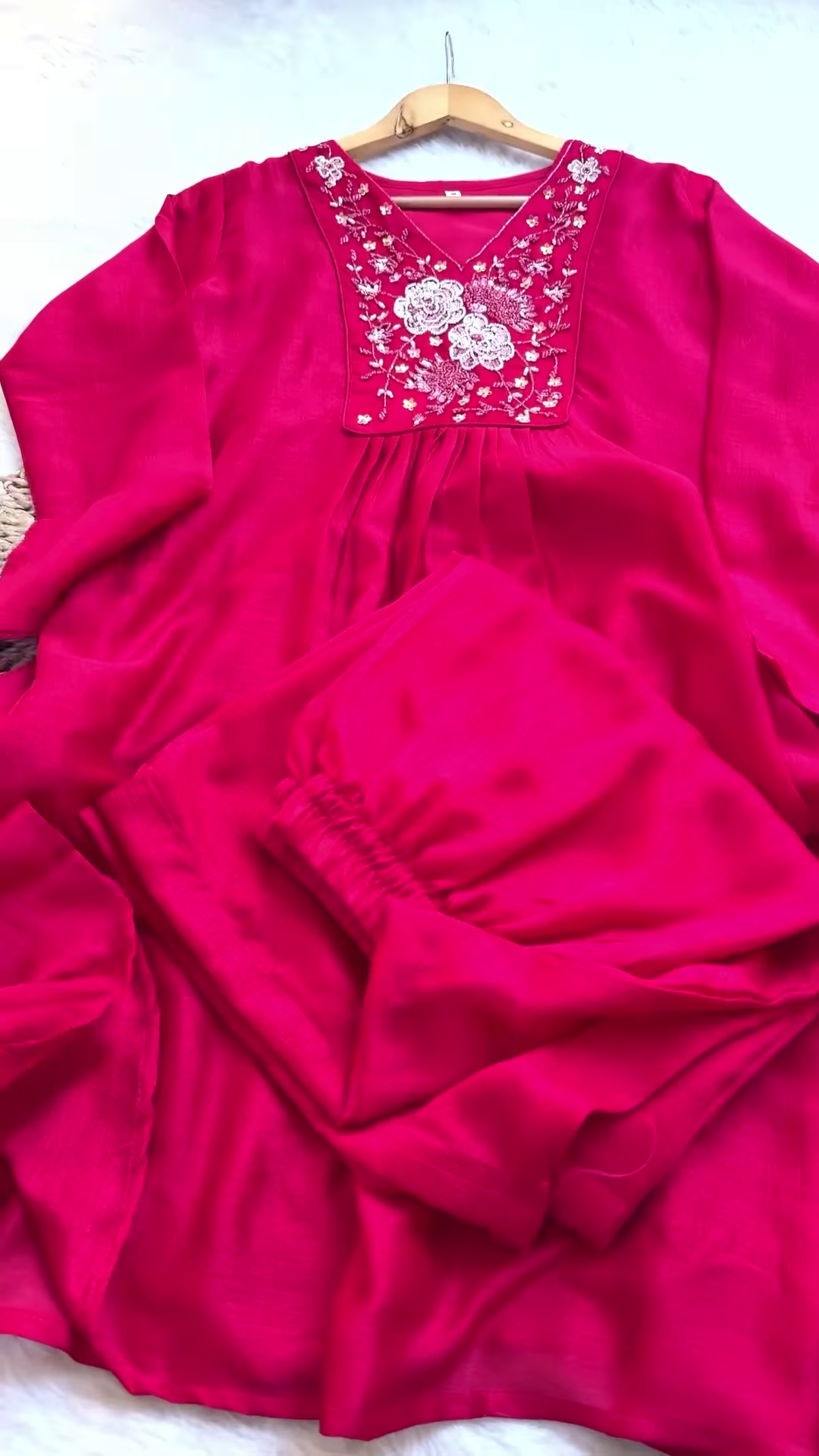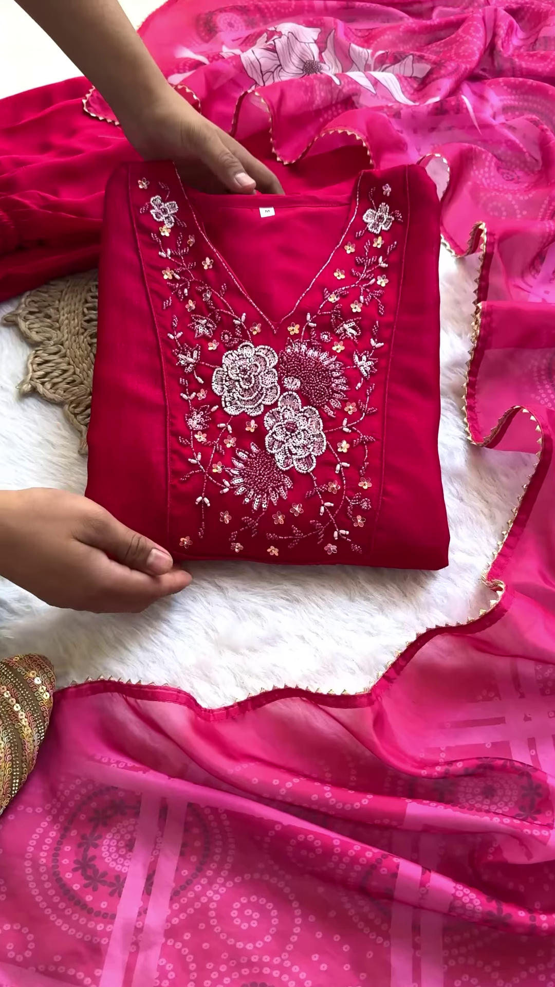 This stunning rose pink suit set is crafted from a luxurious blend of premium silk and georgette, ensuring a soft, smooth texture with an elegant drape. The fabric is breathable and lightweight, making it an ideal choice for both festive and formal occasions. The set comes with a matching chiffon dupatta, which enhances the overall grace of the ensemble.