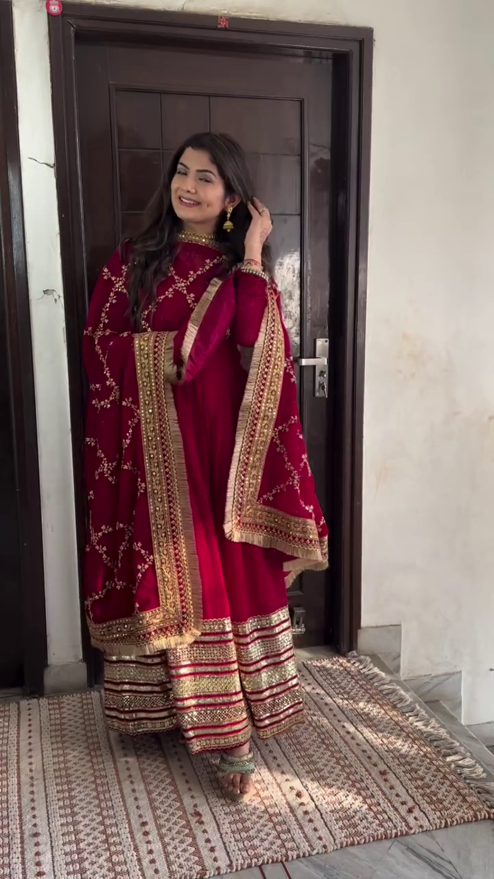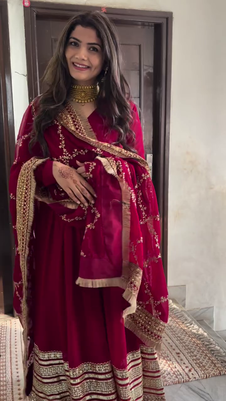 The Anarkali features exquisite golden thread embroidery along the borders, hemline, and dupatta, adding a rich festive appeal. The dupatta is beautifully detailed with floral embroidery and finished with a golden lace trim, elevating its elegance. The suit’s hemline is accentuated with broad striped golden embroidery, making it stand out with royal charm.