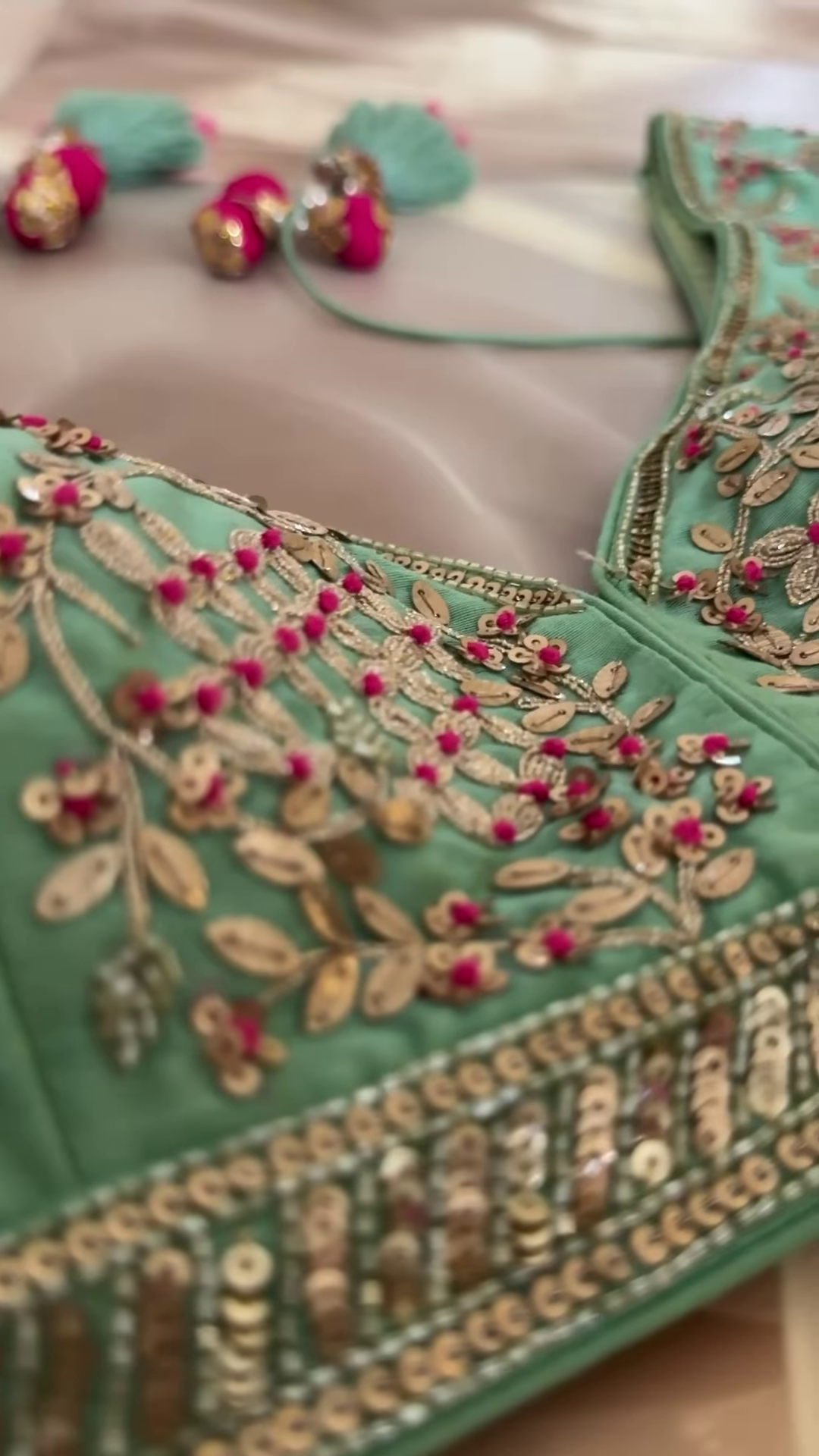 Blouse Fabric: Pastel green raw silk with heavy mirror and threadwork