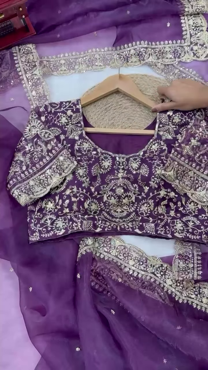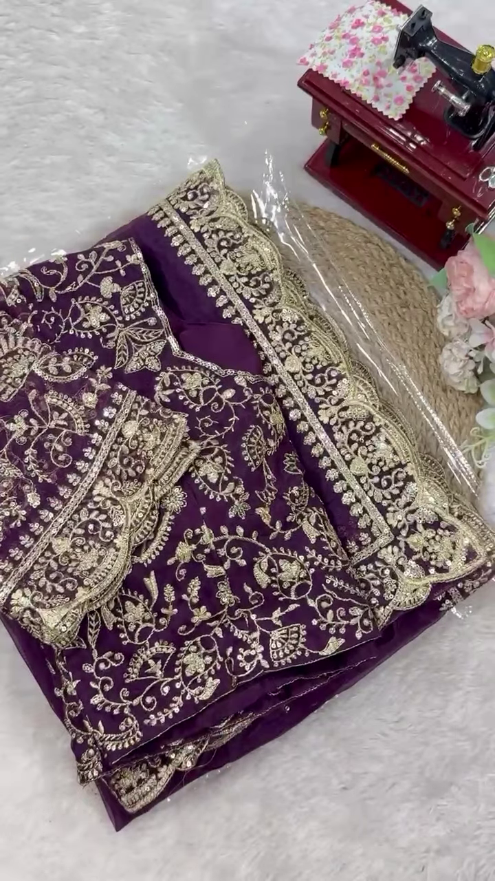 Indulge in luxury with this royal purple heavily embroidered suit, designed to make you stand out at any grand occasion. Crafted with intricate golden zari embroidery, this masterpiece is a perfect blend of tradition and elegance. The deep purple hue adds a regal touch, while the shimmering golden embellishments enhance the overall richness of the outfit.