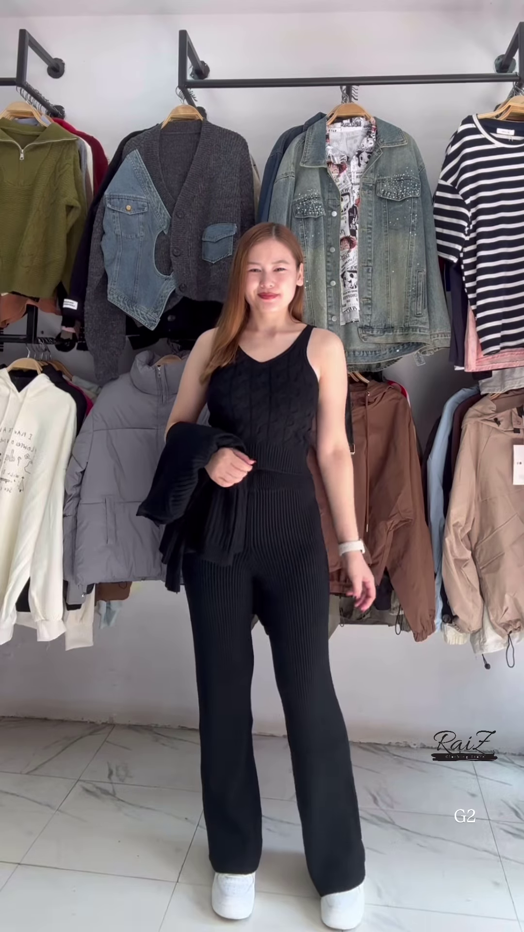 - 🖤 Black: Long-sleeve top and pants in solid black + white shoes for contrast