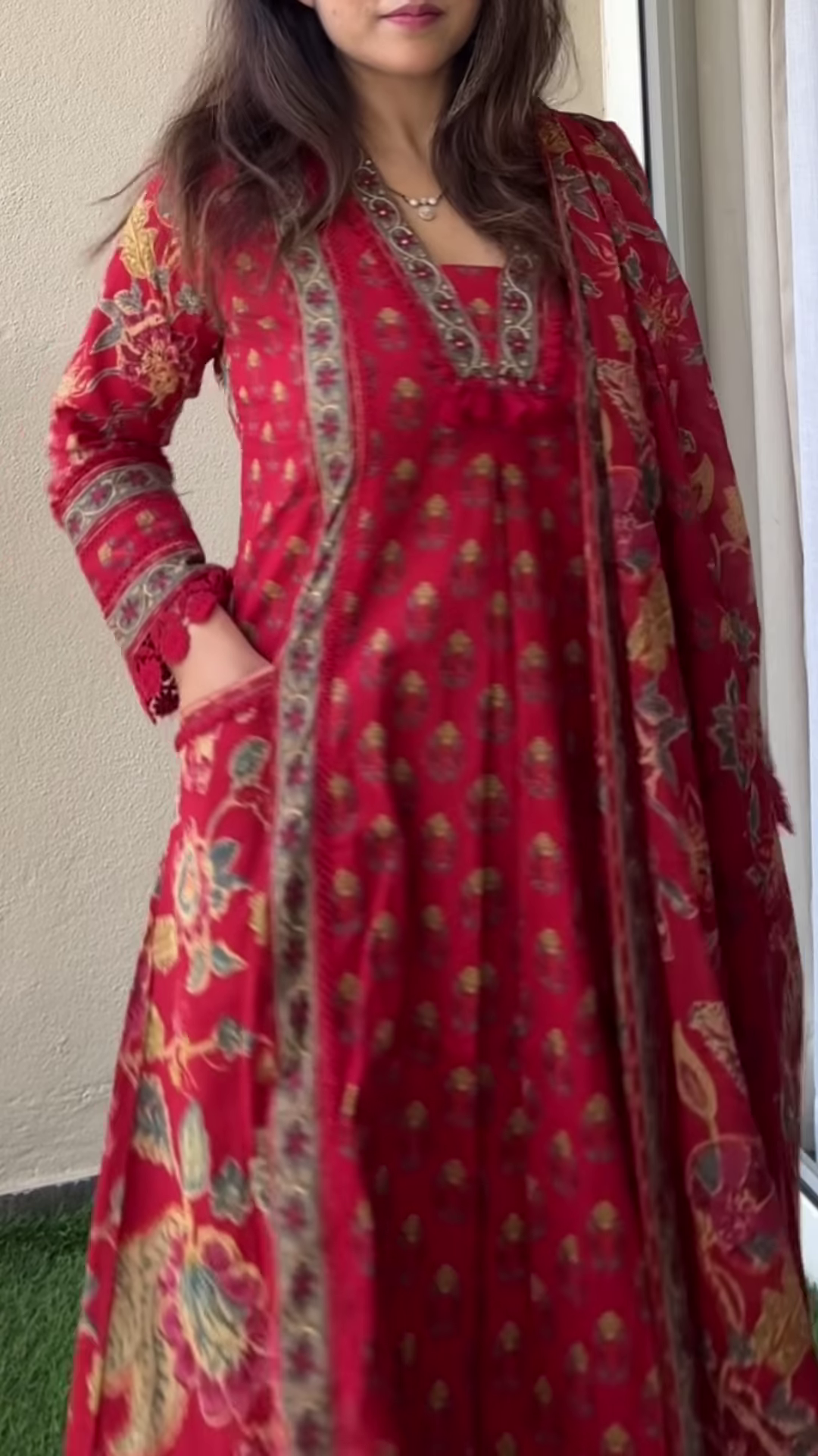 - Drape a contrasting printed dupatta for added elegance.
