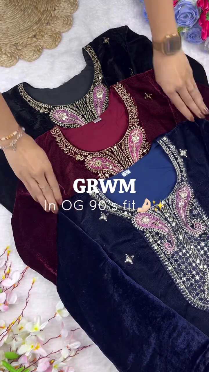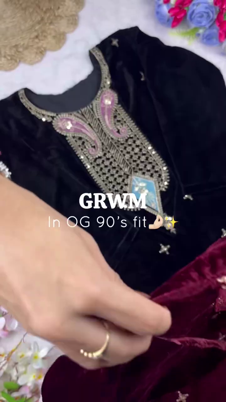 Step back into the golden era with this “OG 90’s fit” designer set. Combining the timeless luxury of plush black velvet with intricate traditional embroidery, this ensemble captures a vintage aesthetic that is perfect for formal winter celebrations and grand evening events.