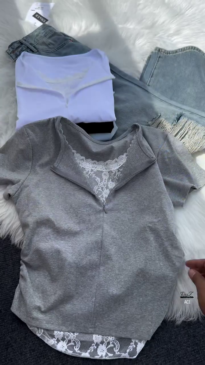 The highlight of this top lies in its stylish V-neckline, subtly layered with intricate white lace detail. The lace insert adds a romantic touch, creating a graceful contrast against the plain grey fabric. This delicate element not only enhances the top’s overall design but also gives it a unique edge, making it suitable for both casual outings and slightly dressier occasions.
